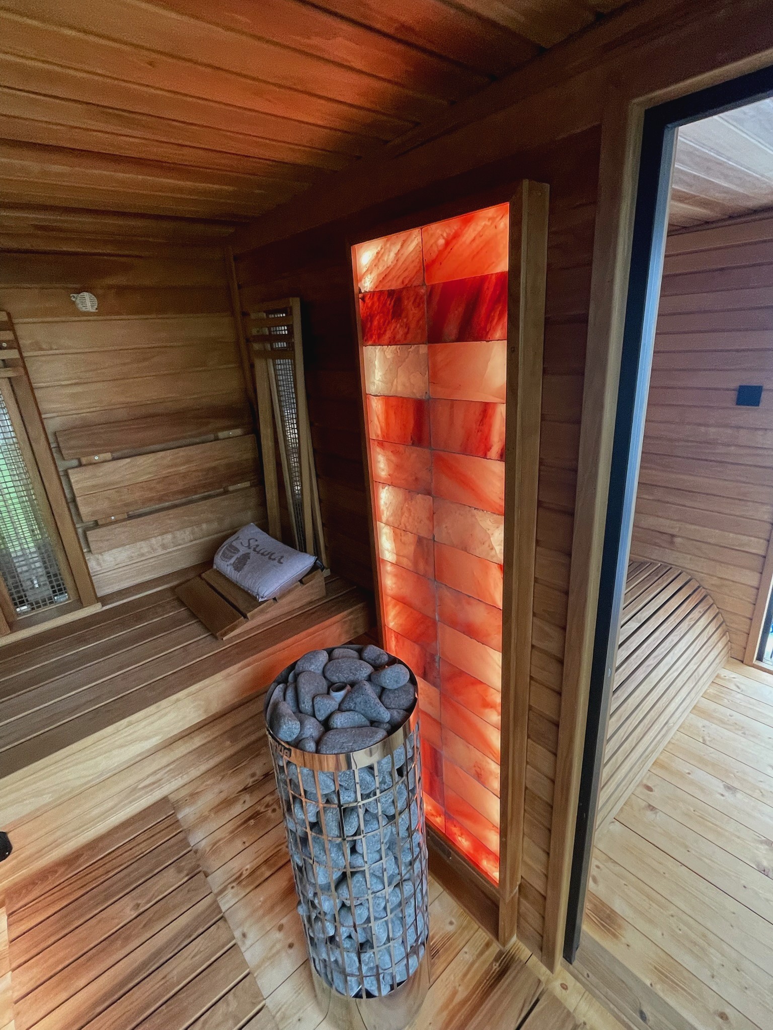Saunu môžete obohatiť o himalájsku soľnú stenu, ktorá má blahodarné účinky a krásne rozptýlené svetlo. Soľ uvoľňuje minerály do vzduchu, čistí dýchacie cesty a navodzuje pocit pokoja.