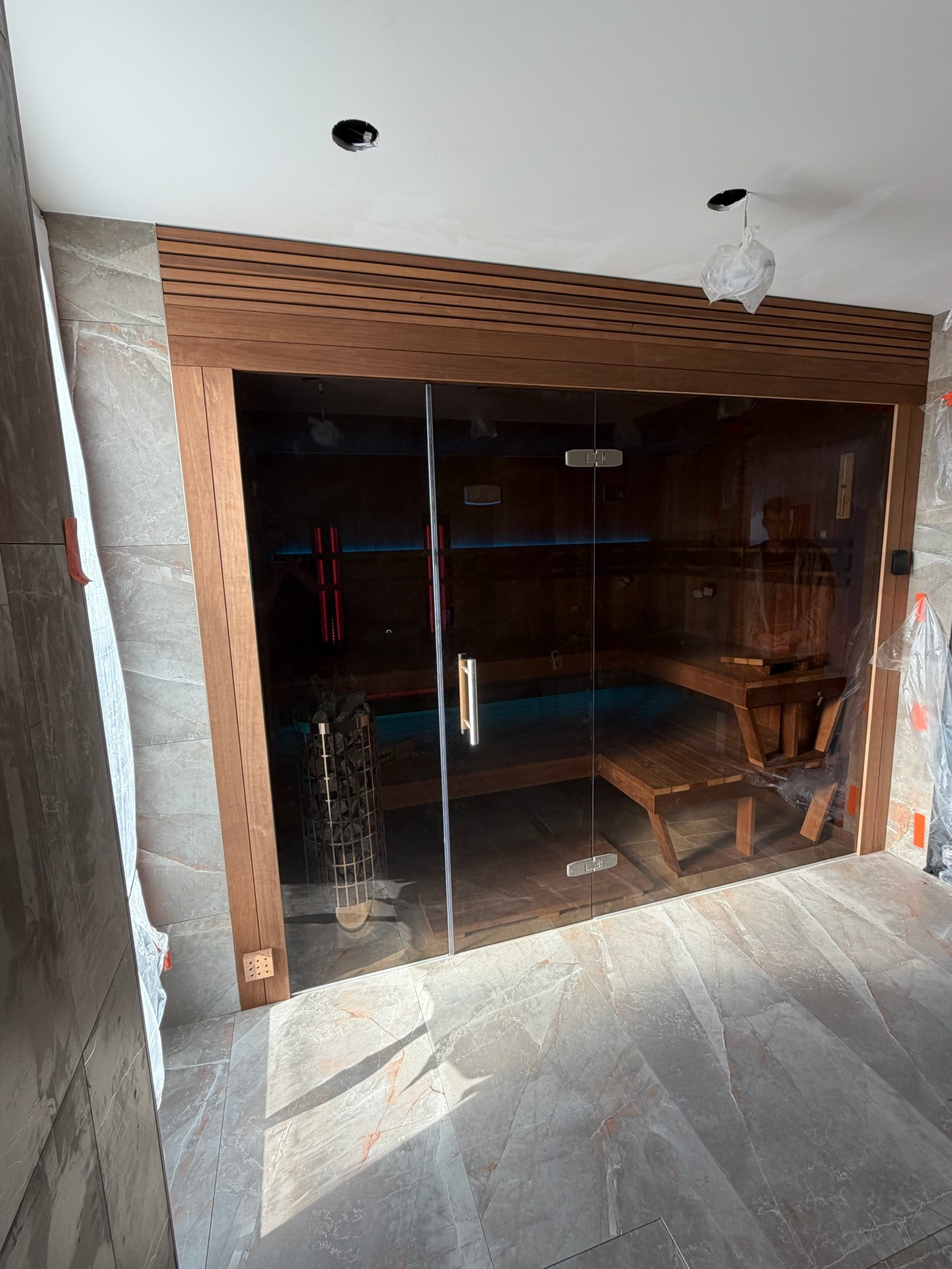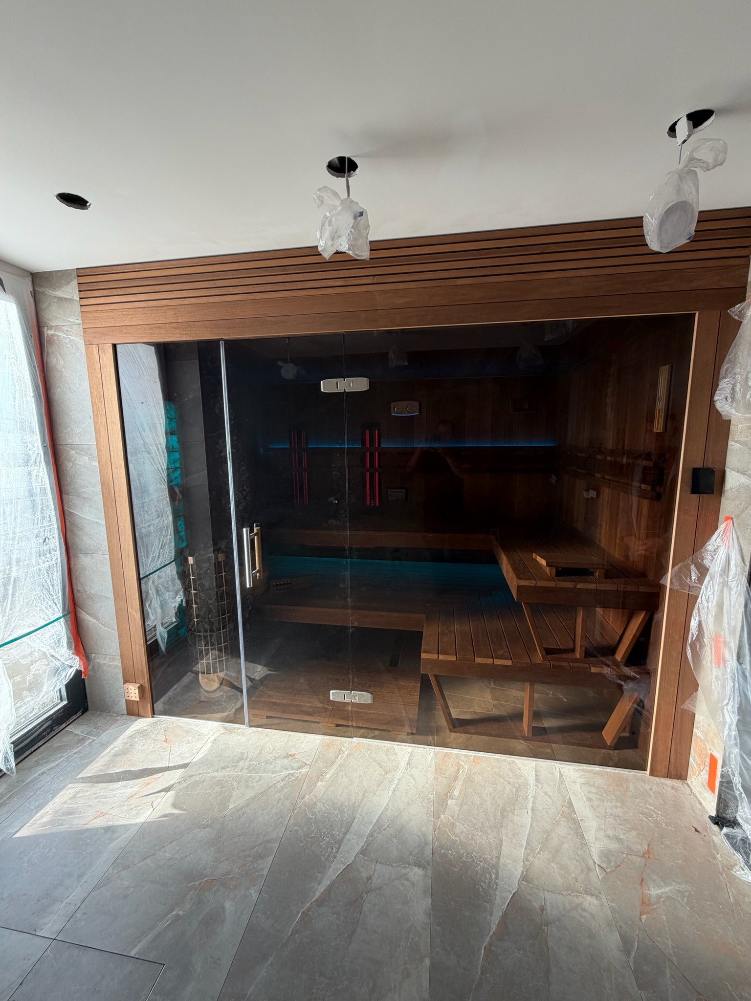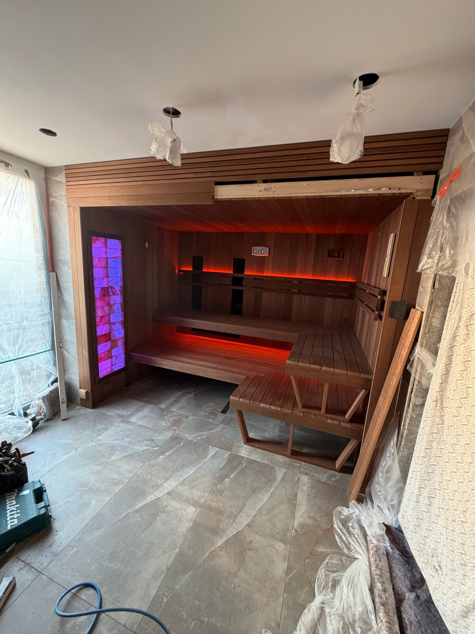 - Presklenna stena -3 okruhy LED pasu, lavica, opierka, soľná stena